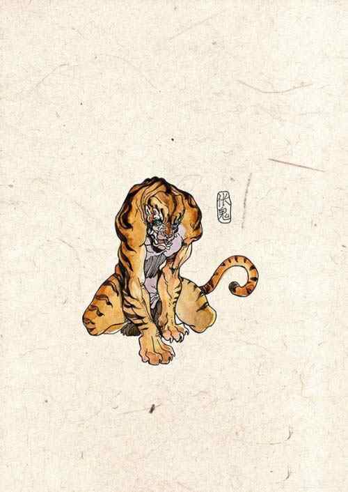 本鬼出自于明《趼廛笔记》所记载的故事。我们以老虎为其陪衬,突出地刻画了这个品质十分卑劣的恶鬼形象。 伥鬼是一种特殊的鬼,指的是那些被老虎吃掉的人,其鬼魂变成为老虎服役的鬼,他经常引诱别人来喂老虎。“为虎作伥”这一成语的出处就源于此。在中国历代笔记小说中,关于伥鬼的记述很多。