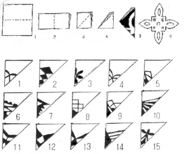 3. 四角形折剪法:两次对折,再沿对角线折,描画一半纹样,剪之。但设计时必须注意左右两边要有连接点,否则会剪成单独碎片。