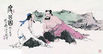 壁画的背景是青山绿水,色彩古朴沉稳。在画面中心位置,钟离权和吕洞宾两人一右一左对坐在磐石上。钟离权身着石绿色长衫,前胸袒露,肤色赤红,长髯飘然,足着芒鞋,一副逍遥于山水间的神仙姿态。画面展现的他正单脚屈膝而坐,身体微侧,右手撑于石上,为吕洞宾传授玄机。他左手屈两指,嘴唇微启,似乎正将两条不同的人生之路摆在吕洞宾眼前;双眼炯炯有神,又似在悄悄观察对方的反应。吕洞宾则作书生打扮,他端坐石上,身着白袍,面白有须,眼皮微垂,似在凝神聆听。他双手做拱,左手大拇指轻捻右手衣袖,衬托出内心的紧张与矛盾。他神态恭谨,眉间露出反复思虑的神色,虽外形静肃,但内心却似波涛起伏。